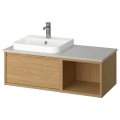 Comprises: 1 wash-stand with drawer, 1 open cabinet, 1 countertop, 1 semi-recessed wash-basin, 1 water trap and 1 mixer tap.