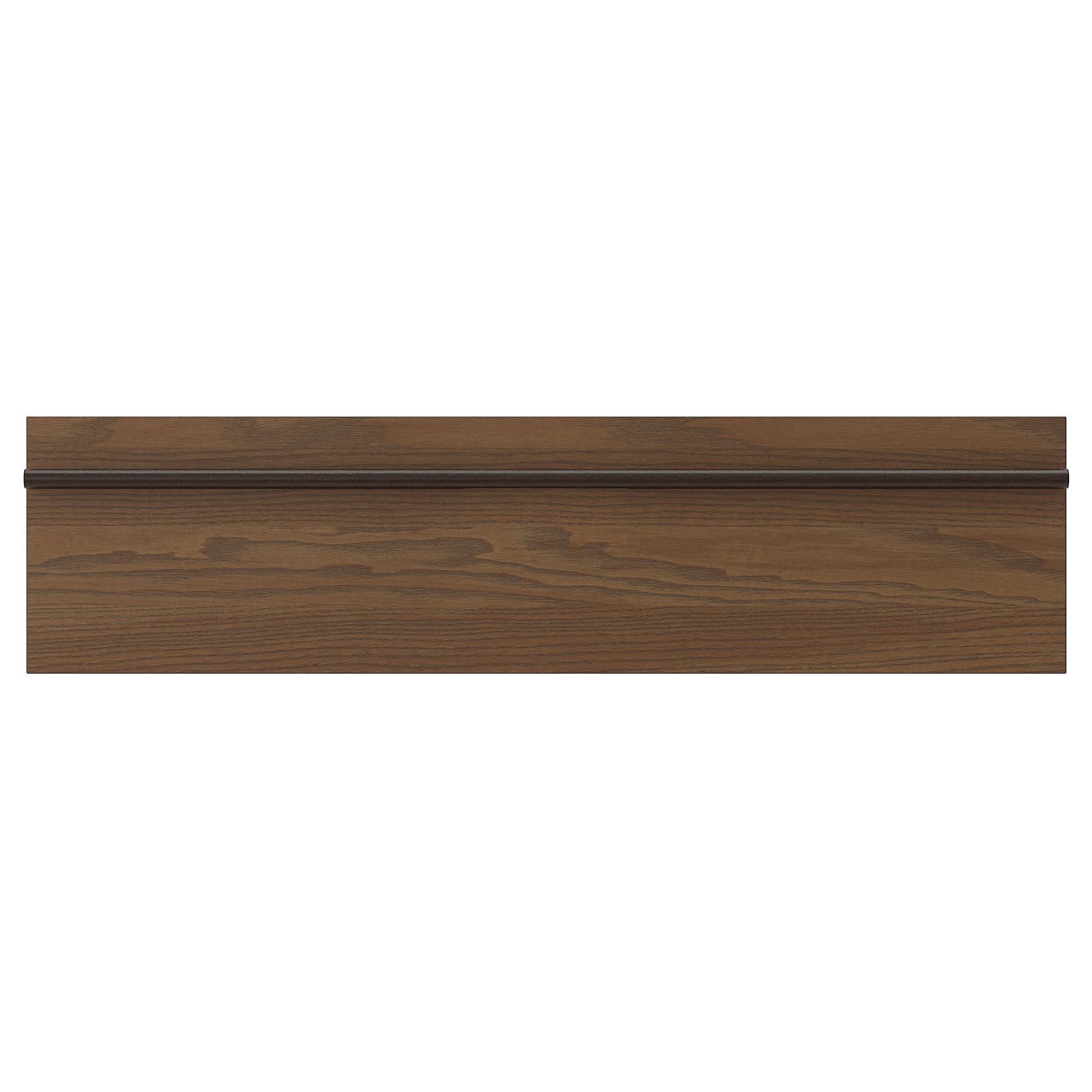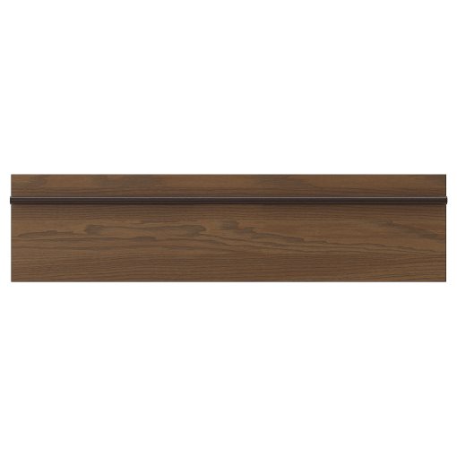 STENSTA kitchen fronts in dark brown stained ash veneer have a vibrant grain pattern matched with solid wood handles stretching across the width of the front to enhance the beautiful linear expression.