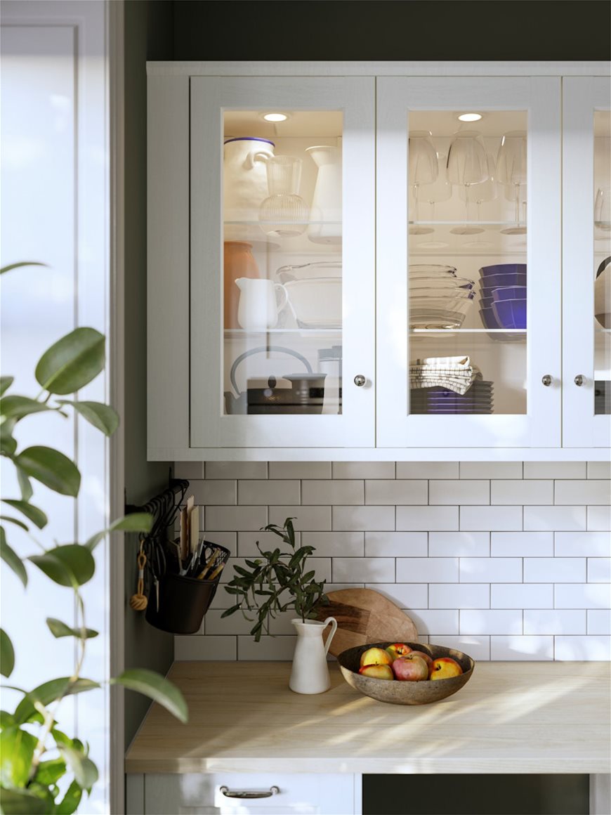 Μπορείτε να προσθέσετε γυάλινες πόρτες και να αναδείξετε περισσότερο τη κουζίνα σας μιας και το γυαλί αντανακλά το φυσικό φως δημιουργώντας μία πιο ωραία ατμόσφαιρα. Διαθέτουμε και ρυθμιζόμενο και εύκολο στην εγκατάσταση φωτισμό για το εσωτερικό των ντουλαπιών, ώστε να ενισχύσουν την ατμόσφαιρα και να αναδείξουν περισσότερα τα αντικείμενα που βρίσκονται μέσα.