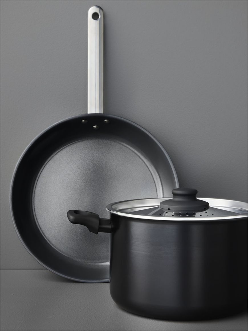 Ως υλικό, το αλουμίνιο είναι εξαιρετικός αγωγός της θερμότητας και εξασφαλίζει ομοιόμορφο μαγείρεμα. Οι αλουμινένιες κατσαρόλες και τα αλουμινένια τηγάνια IKEA έχουν αντικολλητική επίστρωση, κι έτσι είναι κατάλληλα για το μαγείρεμα όξινων τροφών.